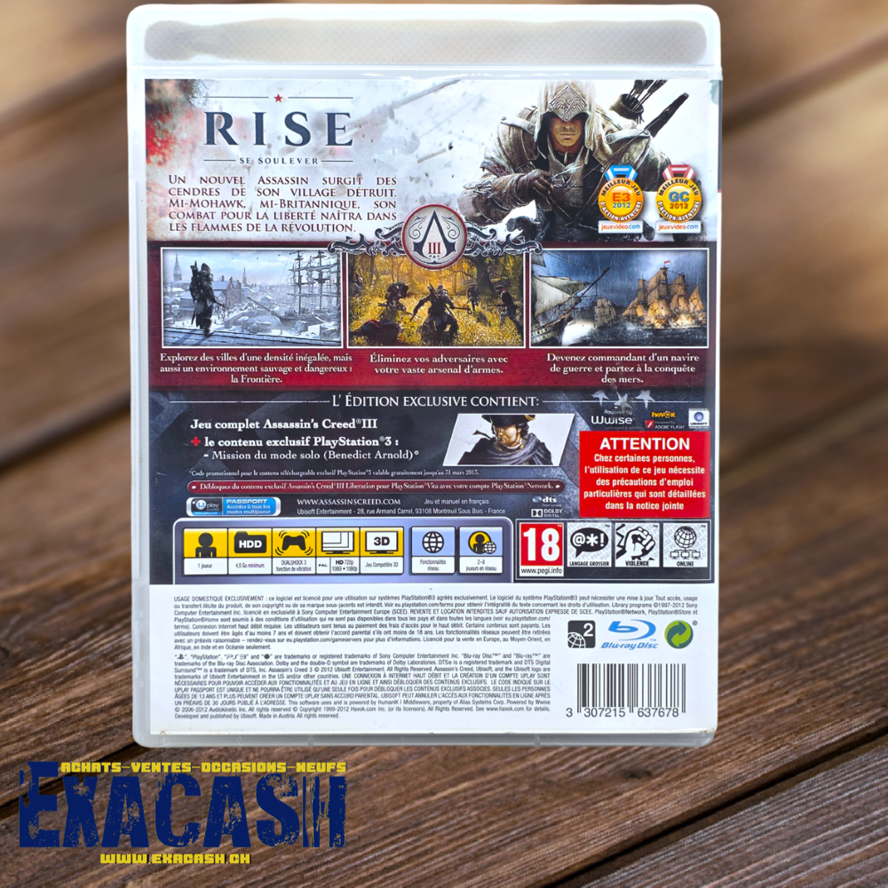 Synopsis : Assassin’s Creed III est un jeu d’action-aventure sur PS3. Desmond essaye de prévenir une éruption solaire destructrice malgré l’éternel conflit entre Assassins et Templiers. Via l’animus, il se plonge en pleine révolution américaine sous les traits d’un de ses ancêtres aux origines anglaises et amérindiennes : Connor Kenway. Armé d’un Tomahawk, le joueur explore Boston et New-York en bénéficiant d’une météo dynamique.