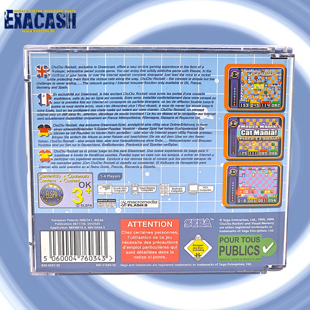 Synopsis : ChuChu Rocket! sur Dreamcast est un jeu de réflexion très original. Sur une carte, des souris doivent rejoindre une fusée qui les mettra hors de portée du chat lancé à leur poursuite. Votre but est de positionner des flèches pour les guider jusqu’à l’engin. Le mode multijoueur se joue en ligne.