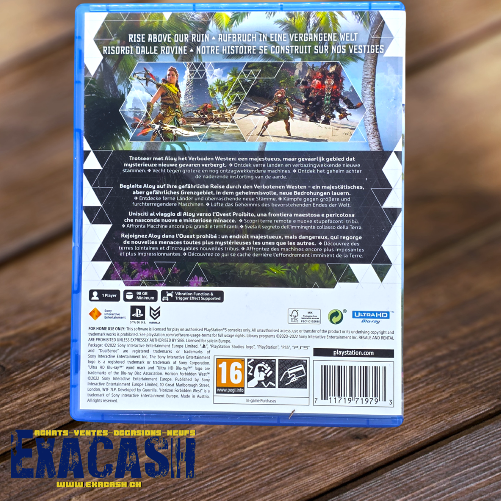 Synopsis : Horizon : Forbidden West est la suite d’Horizon Zero Dawn. Le jeu d’action aventure sur PS5 nous propose de réincarner Aloy, l’héroïne du premier volet, dans un monde post-apocalyptique. Explorez des terres gelées jusqu’aux eaux tropicales en découvrant les ruines de l’ancien monde.
