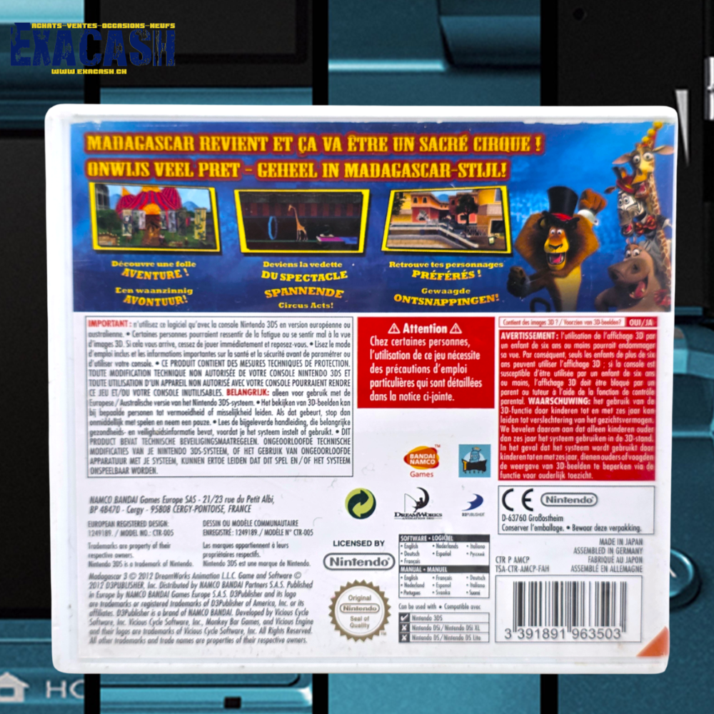 Synopsis : Madagascar 3 sur 3DS reprend les personnages du film du même nom dans un jeu d’action très aérien. Alex, Marty, Gloria et Melman doivent en effet faire la publicité d’un cirque à travers diverses villes européennes. Leurs numéros sont variés et mettent en avant les amis du quatuor. On retrouve donc aussi les lémuriens, les pingouins ou le jaguar.