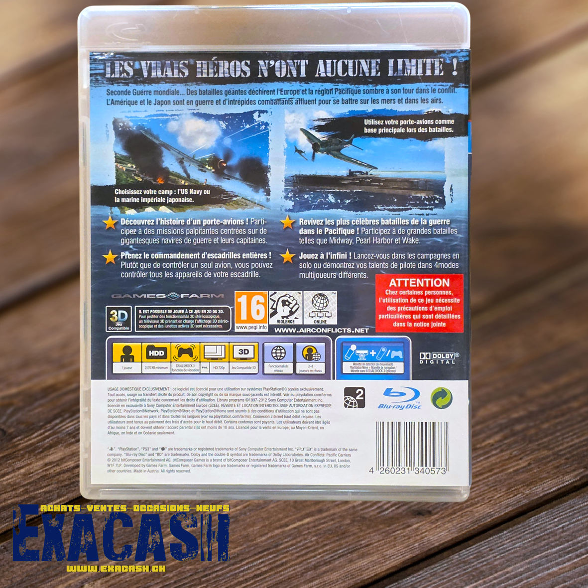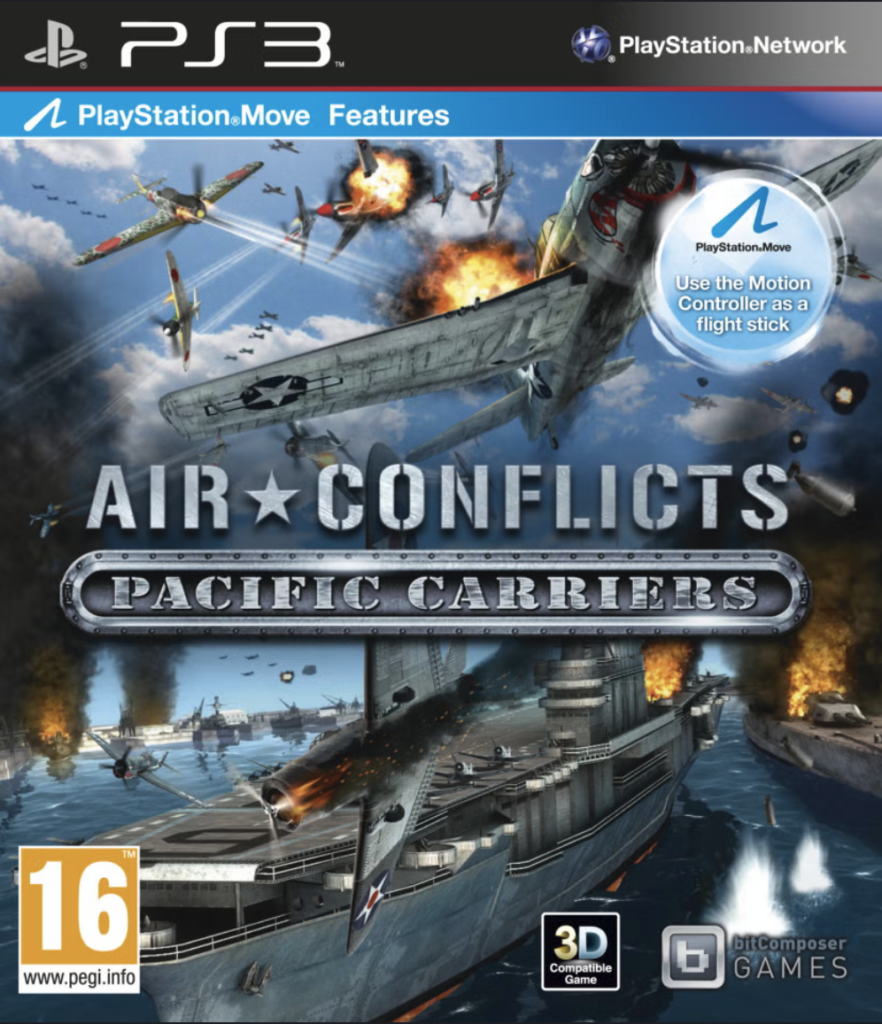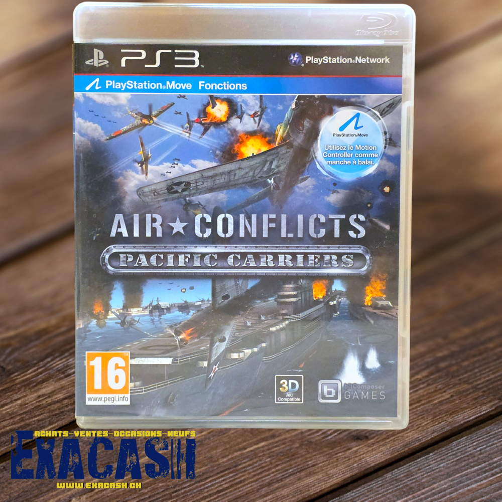 Synopsis : Air Conflicts : Pacific Carriers est un shooter aérien PlayStation 3 sur la Seconde Guerre mondiale. Quatre campagnes, une douzaine d’avions et des missions extrêmement variées dans les airs ou sur la mer sont disponibles pour revivre ce conflit du côté des Américains comme du côté des Japonais. On peut contrôler à volonté tous les avions de notre escadrille et les pilotes gagnent de l’expérience au fil de leurs exploits. Un mode multi permet également à 8 joueurs de s’affronter en ligne.