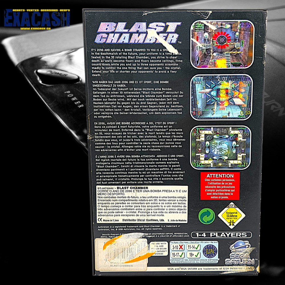 Synopsis : Blast Chamber est un jeu d’action à la troisième personne sur Saturn. Vous voilà en l’an 2096, contrôlant un personnage ayant une bombe attachée sur lui. Préparez-vous à de terribles affrontements dans de nombreux niveaux à l’univers futuriste où le sol devient plafond et le plafond devient le sol. Votre but est de récupérer un cristal qui permettra votre survie et de le garder le plus longtemps possible.