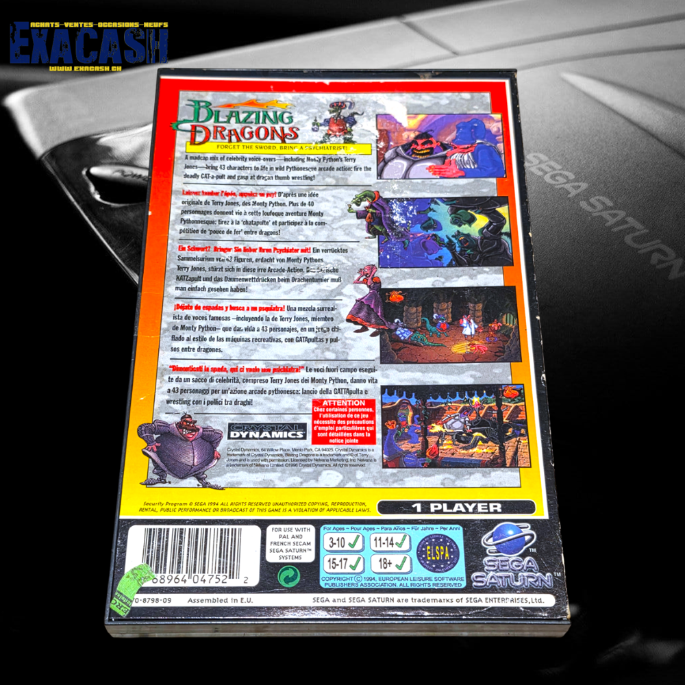 Synopsis : Blazing Dragons est un jeu d’aventure sur Saturn basé sur le dessin animé du même nom qui est une variante de la légende du roi Arthur. Vous incarnez un dragon nommé Fliker qui est inventeur dans le royaume de Camelot. Ce dernier souhaite devenir chevalier et gagner un tournoi afin d’obtenir la main de la princesse Flame. Le principe de jeu est principalement constitué de pointer-cliquer avec quelques phases d’arcade.