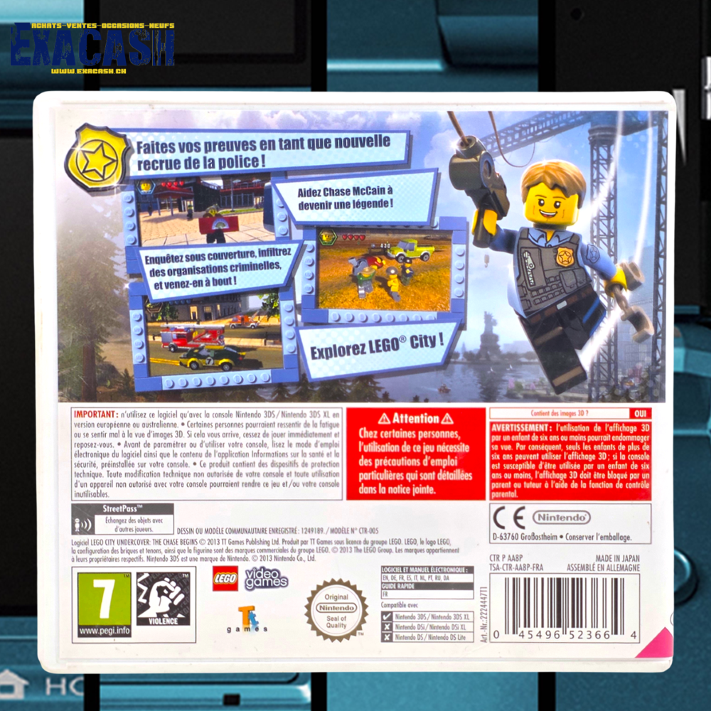 Synopsis : LEGO City Undercover : The Chase Begins sur 3DS est un jeu d’action en monde ouvert, prologue à LEGO City Undercover sur Wii U. On y incarne Chase McCain, recrue de la police locale, dont l’objectif est de coffrer le méchant Rex Furry. Pour cela, notre héros dispose de 7 costumes à débloquer progressivement et lui permettant de switcher de compétences à tout moment.
