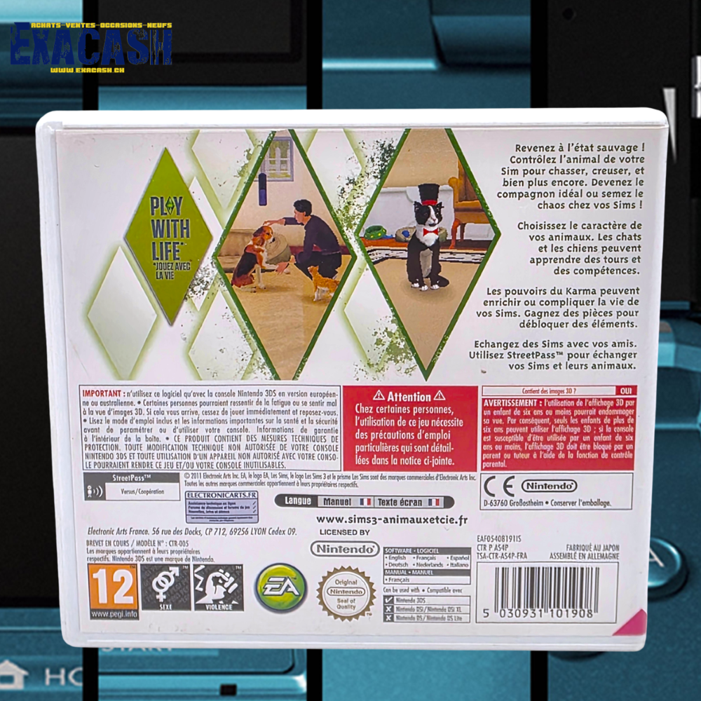 Synopsis : Animaux & Cie est une extension pour le jeu de gestion Les Sims 3 sur Nintendo 3DS. Les joueurs auront l’opportunité de contrôler les fidèles animaux de leurs personnages et de nouveaux lieux et événements sont au rendez-vous. Une centaine de félins et de canidés différents sont proposés et les fonctionnalités de la consoles sont mises à contribution.