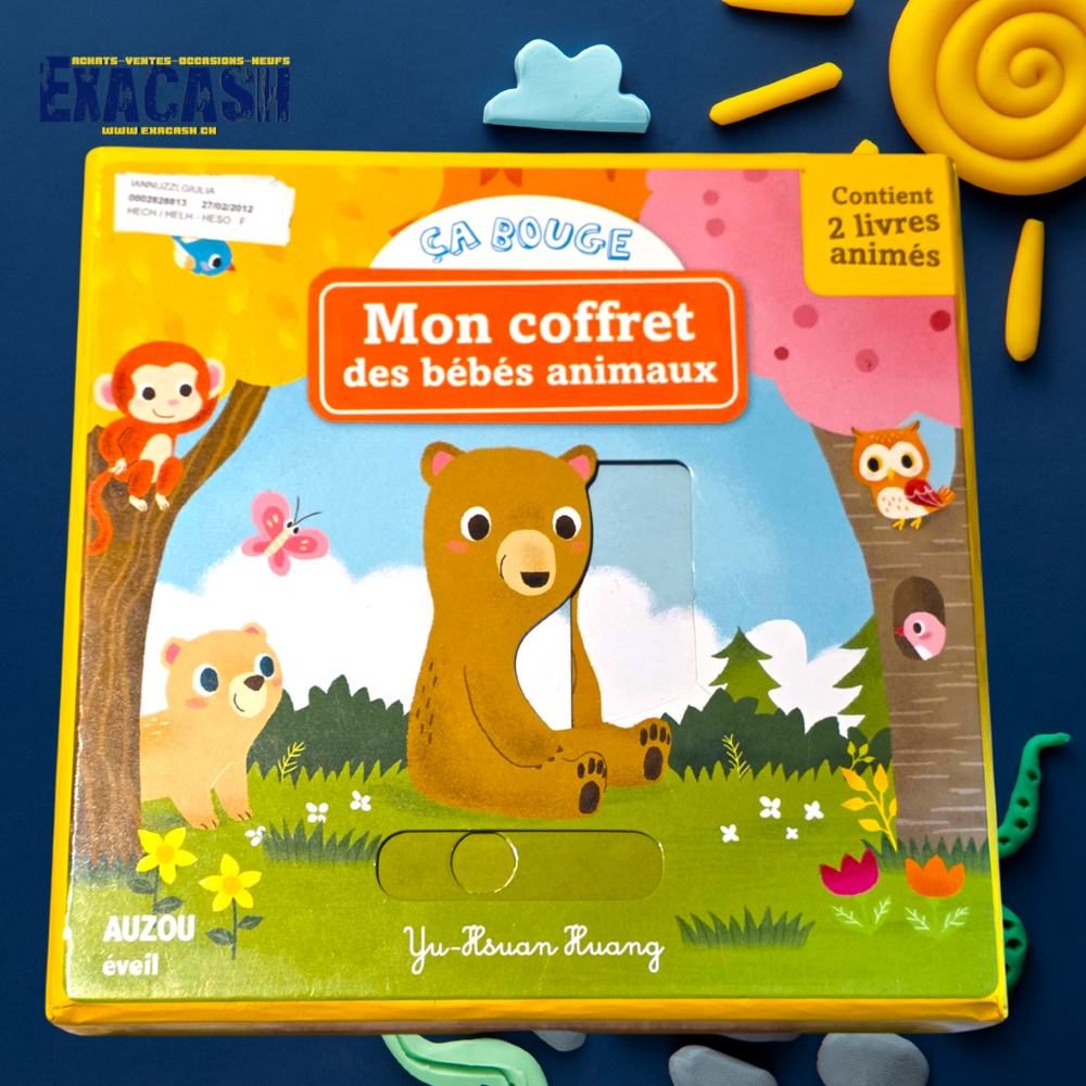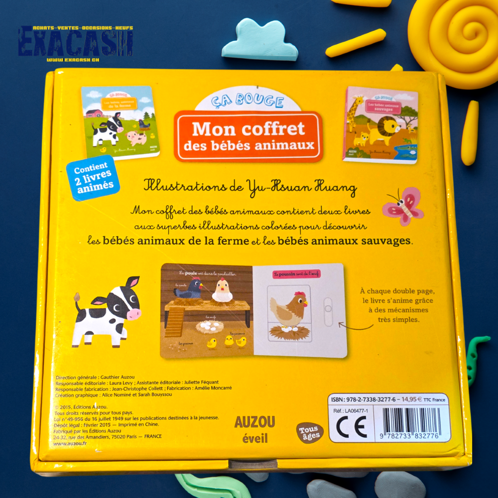 La collection : De jolis co!rets thématiques composés de 2 livres tout-carton pour les plus jeunes. À chaque double page, le livre s’anime grâce à des mécanismes très simples. Le livre : Mon co!ret des bébés animaux contient 2 livres aux superbes illustrations colorées pour faire découvrir les bébés animaux de la ferme et les bébés animaux sauvages aux plus jeunes. Grâce à des mécanismes à activer au gré de leurs envies, les tout-petits découvrent les bébés animaux dans leur habitat naturel.