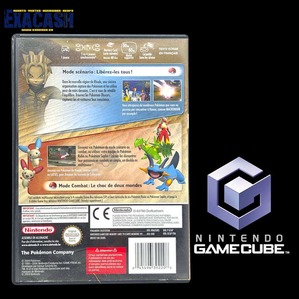 Synopsis : Pokémon Colosseum est un jeu de rôle disponible sur Gamecube. Dans la nouvelle région de Rhode, une sinistre organisation capture des Pokémon et les utilise pour de noirs desseins. C’est à vous de rétablir l’équilibre. Trouvez les Pokémon Obscurs, capturez-les et restaurez leur conscience. Envoyez vos Pokémon du mode scénario au combat et laissez-les démontrer leur puissance lors de combat en simple, en double, ou en multijoueur.