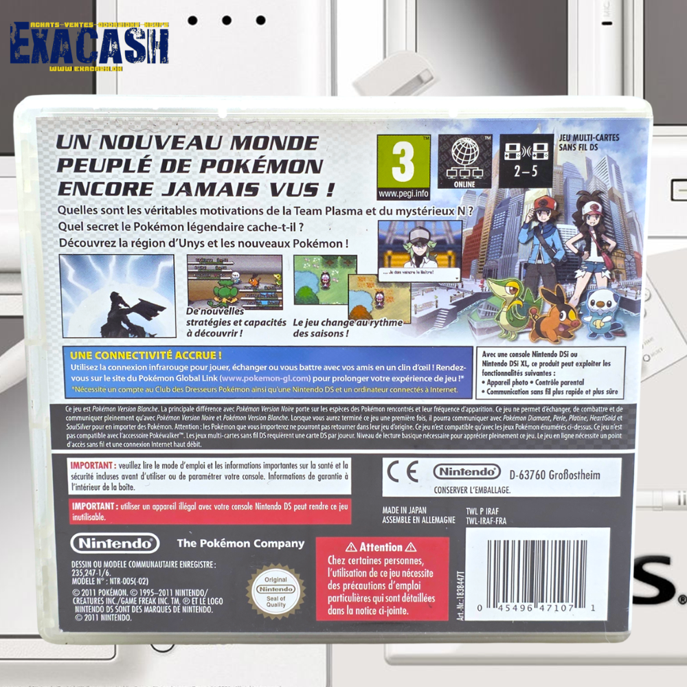 Synopsis : Le jeu de rôle Pokémon Version Blanche sur Nintendo DS introduit une cinquième génération de Pokémon composée de 156 créatures originales ainsi que des nouveautés telles que des combats à trois contre trois ou l’alternance des saisons. On pourra explorer une région inédite en 3D pour traquer la team Plasma tandis que de nombreuses fonctionnalités online nous permettront d’interagir avec des joueurs du monde entier.