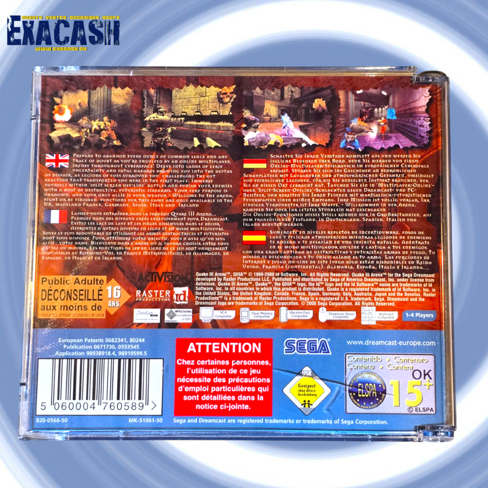 Synopsis : Quake III Arena sur Dreamcast est un jeu de tir à la première personne orienté multijoueur. Un arsenal varié et complet est à votre disposition pour organiser une joyeuse boucherie seul ou par équipe. Les modes classiques du genre sont tous là (Capture The Flag, Possession, Deathmatch…). L’atout majeur de cet épisode sur console est la possibilité du jeu online.