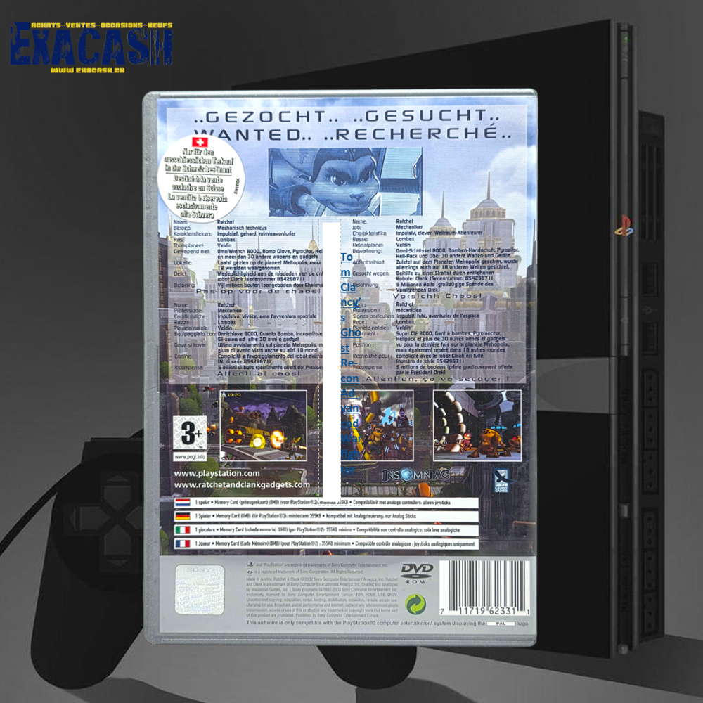 Synopsis : Le jeu de plates-formes Ratchet & Clank sur Playstation 2 met en scène Ratchet, un mécanicien hors pair, et Clank, un petit robot initialement conçu pour aider le Président Drek à imposer sa dictature au monde. A cause d’un défaut de fabrication Clank décide de ne pas aider son boss dans sa funeste entreprise et s’allie à Ratchet. De nombreux gadgets sont à votre disposition pour contrecarrer les plans diaboliques du président.