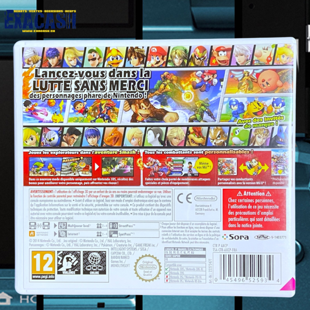 Synopsis : Super Smash Bros. for 3DS est un jeu de combat en arènes dans lesquelles s’affrontent un grand nombre de personnages issus de l’univers de Nintendo, tels que Pikachu, Link, Mario, Samus, ou encore Donkey Kong. De nouveaux combattants arrivent également tels que Mega Man, la coach de Wii Fit, et même le villageois de Animal Crossing. De nombreux modes sont disponibles, et le mode multijoueur est bien évidemment toujours de la partie.